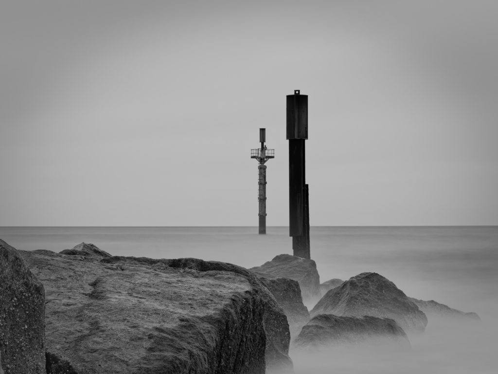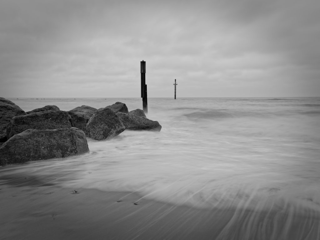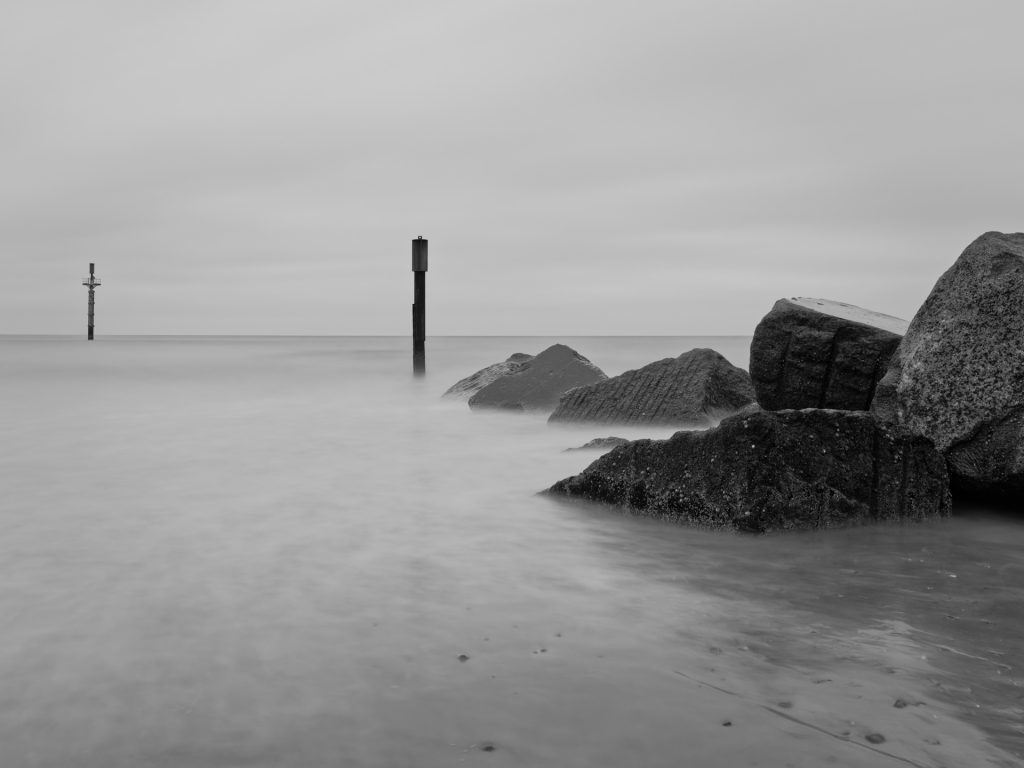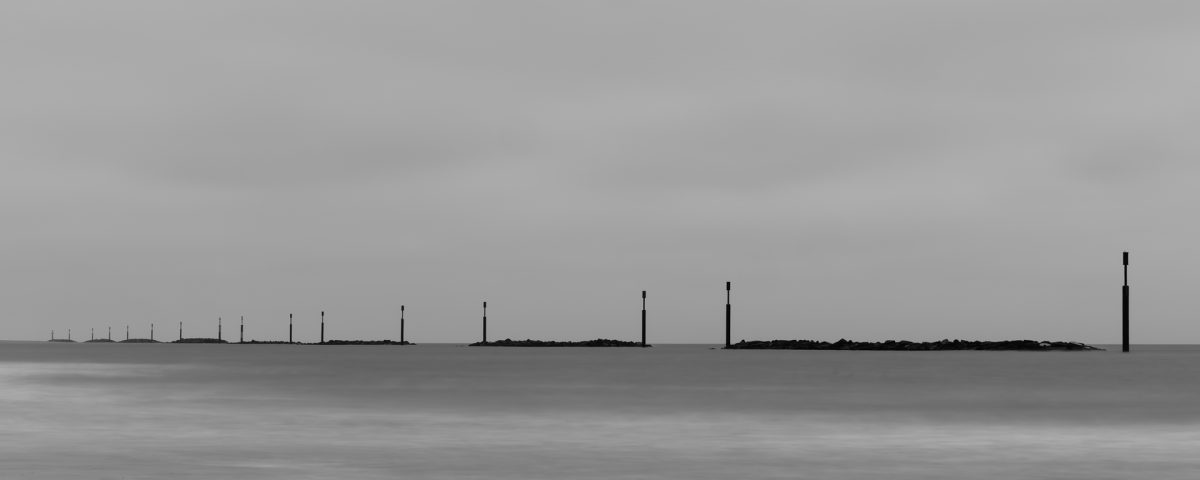 I thought they would make a great subject, so early one morning. So, I drove there, donned my Wellington boots, and walked across the dunes, only to discover that those breakwaters had long gone. Large black boulders now protect the beach. The seascape I remembered was changed entirely.